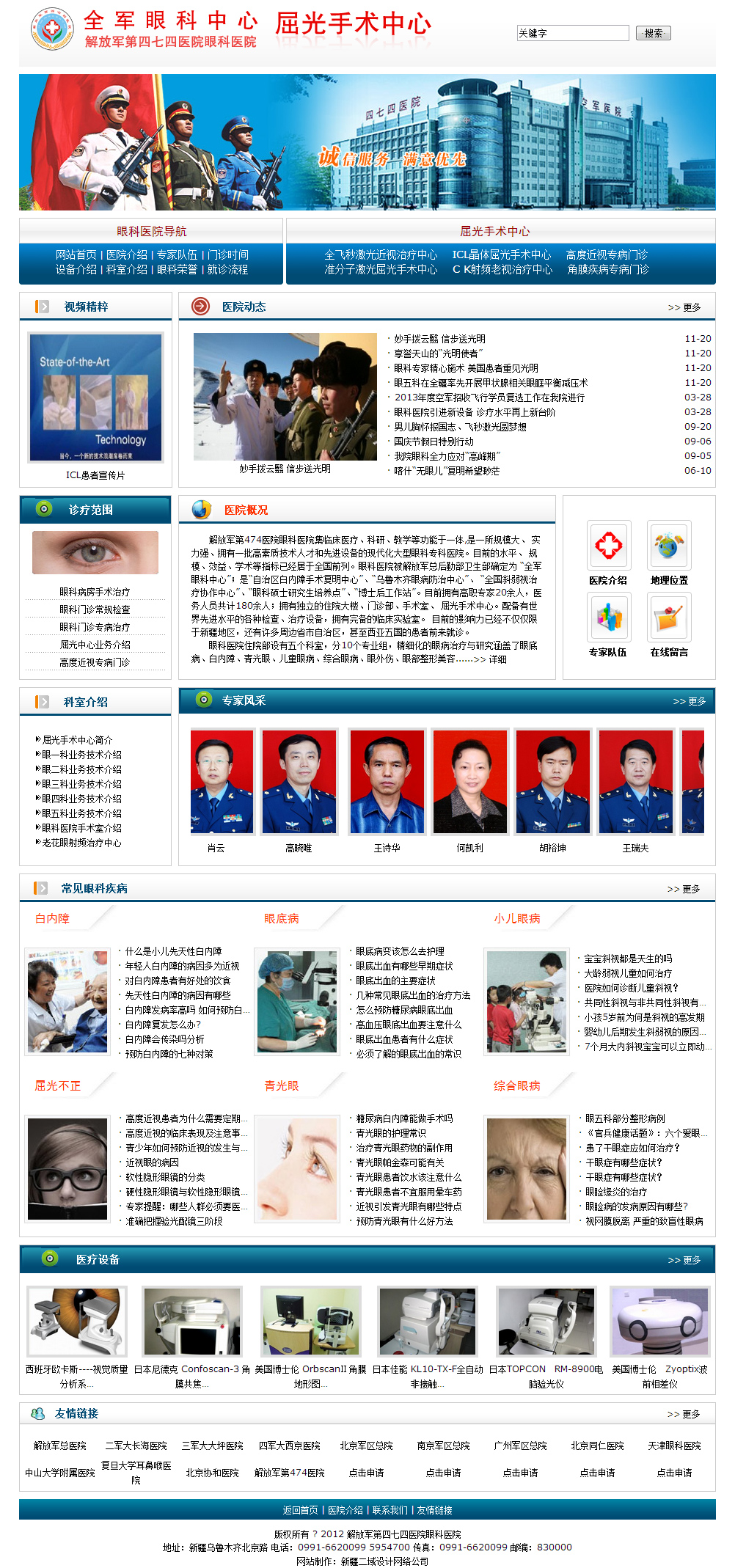 解放軍第474醫院眼科醫院集臨床醫療、科研、教學等功能于一體,是一所規模大、實力強、擁有一批高素質技術人才和先進設備的現代化大型眼科專科醫院。目前的水平、規模、效益、學術等指標已經居于全國前列。眼科醫院被解放軍總后勤部衛生部確定為“全軍眼科中心”;是“自治區白內障手術復明中心”、“烏魯木齊眼病防治中心”、“全國斜弱視治療協作中心”、“眼科碩士研究生學位授予培養點”、“博士后工作站”。目前擁有高職專家25人,醫務人員共計170人;擁有獨立的住院大樓、門診部、手術室、屈光手術中心。配備有世界先進水平的各種檢查、治療和手術設備,設備總價值達8500余萬元,并擁有完備的臨床實驗室。目前該專科整體水平在軍內外同類學科中處于先進地位,其影響力已經不僅僅限于新疆地區,還有許多周邊省市自治區,甚至西亞五國的患者前來就診。