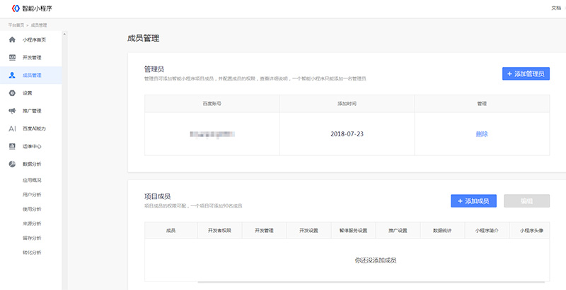 登錄智能小程序平臺,進入平臺首頁- 成員管理,添加智能小程序項目成員并配置成員權限,一個智能小程序只能添加一名管理員。