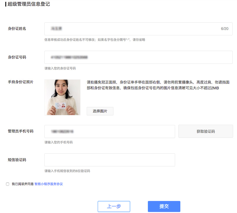 登記 超級管理員姓名、 號碼并 驗證手機號。(超級管理員不支持更換)